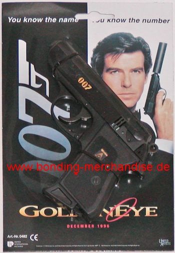 Walther PPK von Wicke, Sohni Wicke, auf GoldenEye Karte card. Lizensiert mit 007 gun symbol logo und dem Promotion Poster mit James Bond Pierce Brosnan, im Online Shop Bonding Merchandise
