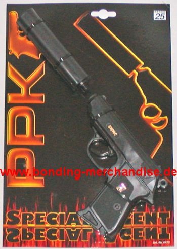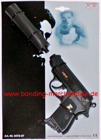 Sohni-Wicke Walther PPK mit Schalldämpfer, silencer, Amorcespistole, cap gun aus der Special Agent Serie für James Bond 007 Fans. Die altbewährte Pistole aus den Filmen mit Sean Connery, George Lazenby, Roger Moore, Timothy Dalton und Pierce Brosnan im Online Shop Bonding Merchandise