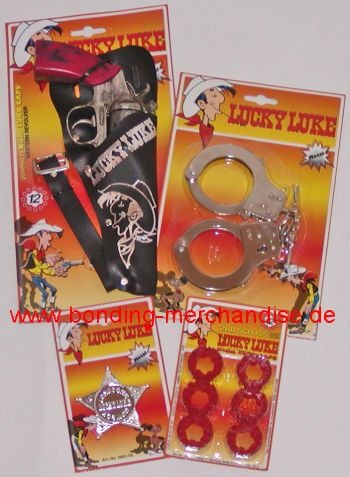 Lucky Luke Set mit Amorcespistole, Zwölfschüsser, twelve shot cap gun im Holster; Metall Handschellen, metal handcuffs mit Schlüssel, with keys; Sheriffstern, sheriff badge "Lonesome Cowboy" und 288 Schuss/shot 12er Ringamorces, 12 shot ring caps, im Online Shop Bonding Merchandise