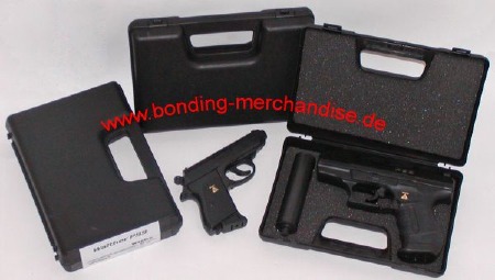 Wicke Walther P99 oder PPK Amorces- pistolen, cap guns mit Schalldämpfer, silencer oder Target Device im kleinen Walther Koffer, case im Online Shop Bonding Merchandise